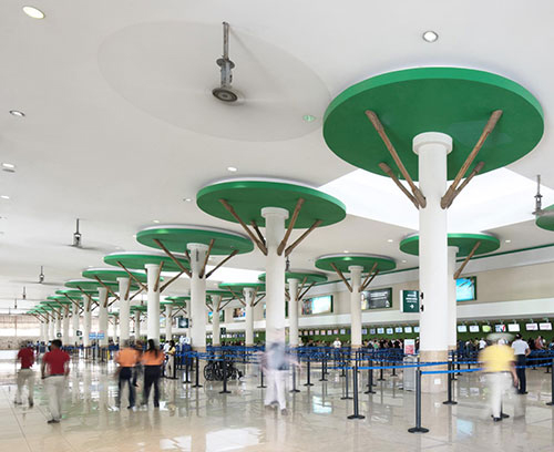Punta Cana International Airport uses new technology such as oversized, industrial-scale ceiling fans for ventilation and air cooling, eliminating the need for central air conditioning.